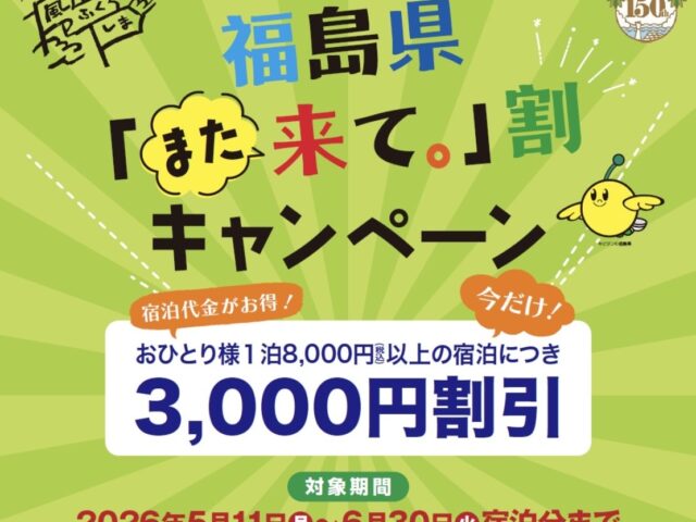 福島県の宿泊割引『また来て。』割が始まります 対象期間 5月11日~6月30日宿泊分 割引額 お一人様8,000円以上の宿泊につき3,000円引 本日4月1日のご予約より受付開始 予算がなくな ......詳細はこちら